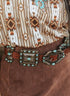 Where old soul meets edge. The Whiskey Rock Belt is crafted from printed genuine leather and finished with vintage silver ribbons and squared conchos, each set with turquoise stones that echo the spirit of the Southwest. Bold and detailed, it’s made to cinch in with character—around denim, suede, or anything that deserves a little Western grit and shine.