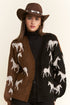 The Canyon Run Cardigan captures effortless equestrian style with a bold two-tone design. Crafted in a soft, stretchy knit, this statement cardigan features striking white horse motifs that run across the front and back, creating movement and visual interest. The relaxed silhouette is finished with cuffed sleeves, contrast trim, and practical front pockets, blending comfort with distinctive detail.