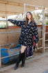 Midnight Herd Dress is crafted from a soft rayon–nylon blend and finished with an allover horse print that feels graphic and timeless. Designed with a button-up front and a subtle peplum silhouette, it offers gentle structure through the waist while maintaining an easy, wearable shape.