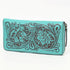 Introducing the Mesa Verde Tooled Leather Wallet, a stunning accessory that combines functionality with southwestern charm. Measuring 4 inches in height, 8 inches in width, and 1 inch in depth, this wallet is expertly crafted from high-quality leather, featuring intricate tooling that showcases a beautiful, textured design. The rich turquoise hue adds a vibrant touch, making it a standout piece for any occasion.
