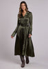 The Verde Valley Dress captures Western refinement with an elegant, modern edge. Crafted from smooth poly satin in a rich olive hue, it drapes beautifully with a soft sheen that catches the light. Designed with a classic open notch collar, single-point front and back yokes, and signature smile pockets, this dress nods to authentic Western tailoring. A full snap-front placket and wide cuffs with single snaps add subtle structure, while the fitted waist and matching self-tie belt create a flattering silhouette. Finished with side seam pockets and precise front and back waist darts, the Verde Valley Dress blends timeless charm with effortless sophistication—made for the woman who moves with grace from day to night.