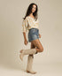 High waisted, easy fitting denim short, with a frayed hem and faded indigo wash. Classic Sendero denim packaging, including custom shanks and rivets, pocket bag print, main and size labels, and a printed paper back patch.