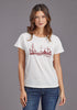 Stetson Desert Horizon Graphic Tee, a vintage white short-sleeve cotton t-shirt featuring a classic crew neck and drop shoulders for a laid-back vibe. distressed detailing adds a worn-in look, while the raw hemline and sleeve openings enhance the vintage appeal. the front showcases a dark red "stetson" rope font with a desert scene screen print, adding a bold and rustic touch. perfect for casual wear with a touch of western flair.
