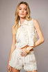 Soft meets spirited in the Ruffle Ranch Blouse—a sleeveless collared top with Western charm and feminine detail. Designed in a creamy hue, it features cascading ruffles and delicate eyelet lace trim along the front and hem for a vintage-inspired finish. The structured collar adds a touch of tailored edge, balancing the soft silhouette with just enough grit.