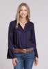 Feminine details meet Western charm in the Bluebonnet Ruffle Blouse. Crafted from soft navy rayon challis, this blouse features delicate ruffle trim along the neckline, yokes, and cuffs for a touch of romance. Bell sleeves add graceful movement, while the open V-neck with a hidden placket and button-front closure keeps the look refined. A versatile Roper design, perfect for pairing with denim or dressing up with statement accessories.