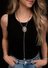 Introducing the Winona 20" with 6" Tail Silver Chain Lariat Necklace – a striking blend of bohemian elegance and Western-inspired design. This lariat necklace features a 20" chain with an additional 6" tail, creating a versatile and dynamic look. The concho accents add a touch of Southwestern charm, making it a unique and eye-catching accessory. Whether worn casually or as a statement piece, the Winona Lariat Necklace effortlessly infuses your style with a hint of free-spirited allure and Western flair.