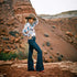 As classic as they come, this dark wash denim has just enough gold stitching on the pockets to add a little something extra to any outfit. Plus, the perfect amount of flare goes well with anything from heels to boots.
