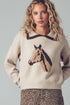 The Equestrian Legacy Knit captures classic equestrian style with a modern twist. Crafted in a soft, medium-weight taupe knit, this sweater features a bold horse motif across the front for a distinctive Western statement. A square neckline framed in contrast brown adds structure and polish, while dropped shoulders and a relaxed, boxy fit create an easy silhouette. Perfect for pairing with denim or skirts, it’s a versatile piece that brings warmth and timeless character to any wardrobe.