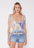 A summer must-have! This tank top, designed with a floral patchwork print, features a surplice v-neckline, tie shoulder detail, and a snug smocked hem. The perfect addition to any bohemian-inspired collection.