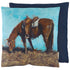 A cotton pillow from our Western Collection displaying a hand painted scene of a grazing horse wearing a saddle. Horse pillow features coordinating blue color cotton on the back. Western pillow includes a zipper to easily remove and clean machine-washable pillow cover. Our Ready To Ride pillow contains polyester filling and is shipped vacuum-sealed for protection and storage. A western home accent perfect for adding style to any room.