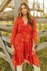 This vibrant red wrap dress combines western charm with a modern twist. Featuring a bold boot stitch print, it showcases long sleeves, a flattering V-neckline, and a cascading ruffle detail that adds movement to the maxi length. The cross-over design ensures a secure fit, while the lining provides comfort and coverage. Ideal for making a statement at any rodeo or western event.