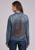 The Stetson Desert Horizon Jacket captures the spirit of the West with effortless sophistication. Crafted from soft blue lyocell denim, this pullover-style shirt jacket features a fold-down collar and a wide half-snap center front placket that adds a modern, easygoing silhouette. Intricate embroidery across the back evokes the vast beauty of desert horizons, while seaming along the back of the sleeves and open cuffs provide a relaxed finish. Combining artistry with Stetson’s enduring craftsmanship, this piece stands as a refined expression of Western heritage and contemporary style.
