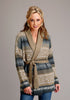 Womens khaki serape hip length cardigan sweater. Shawl collar and khaki tie at waist. Side seam pockets. 85% Acrylic 15% wool